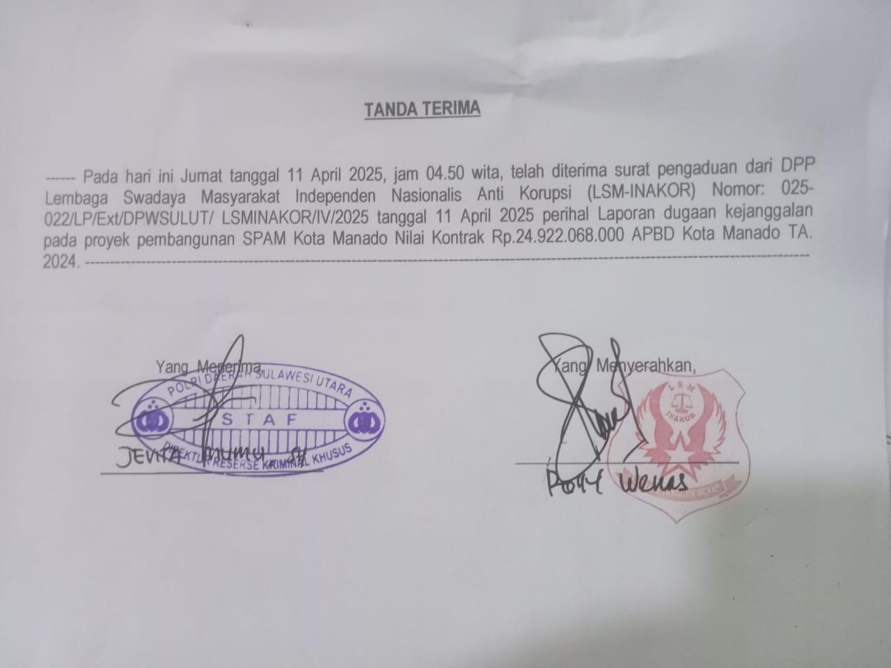 Manado, CITAWAYA.ID – Lembaga Swadaya Masyarakat (LSM) Independen Nasionalis Anti Korupsi (INAKOR) Sulawesi Utara resmi melaporkan proyek strategis daerah Pembangunan Sistem Penyediaan Air Minum (SPAM) Kota Manado ke Kepolisian Daerah (Polda) Sulawesi Utara, Jumat (11/4). Proyek senilai Rp24,9 miliar yang bersumber dari APBD Kota Manado Tahun Anggaran 2024 itu diduga rawan penyimpangan dan berpotensi merugikan keuangan negara.